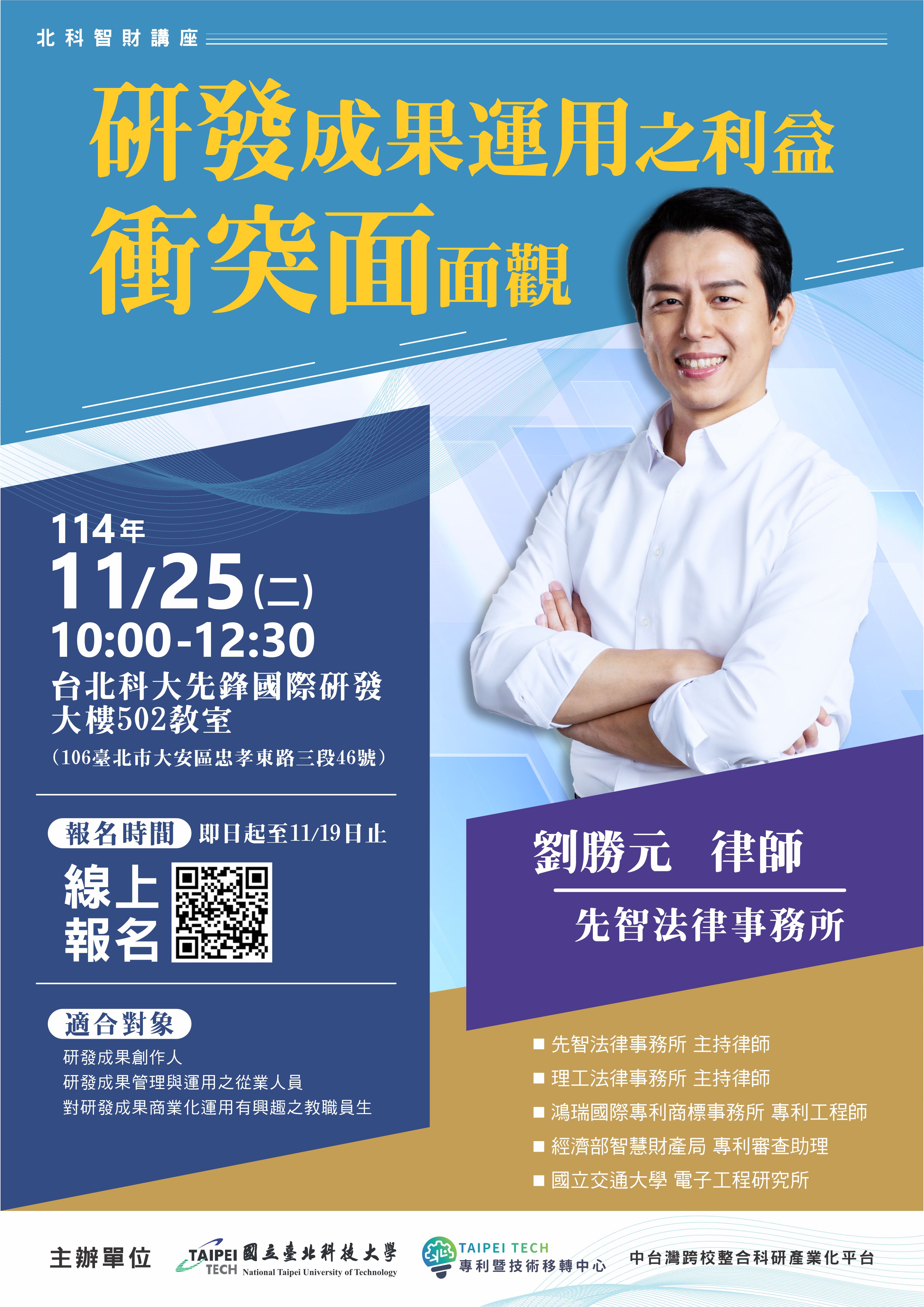 【活動】114/11/25(二)智財講座:研發成果運用之利益衝突面面觀,歡迎大家踴躍參加。